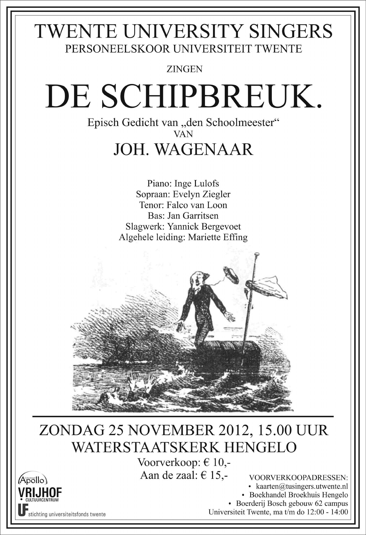 Vooraanstaand en veelzijdig Nederlands componist Johan Wagenaar (1862-1941) vond zijn inspiratie voor “De Schipbreuk” in het gelijknamige gedicht van de Nederlandse dichter Gerrit van de Linde (1808-1858), beter bekend als “De Schoolmeester”. De schipbreuk is een ‘humoristische cantate’ voor klein koor en solisten (sopraan, tenor, bas), begeleid door piano en slagwerk. Wagenaars voorliefde voor het – liefst spottend – gebruik van populaire volksliedjes en het persifleren van uiteenlopende muziekstijlen komt in dit werk ruim aan bod. Zo combineert hij een Italiaanse aria, een zeemanskoor, een fuga waar maar geen eind aan lijkt te komen en een heuse Weense wals.