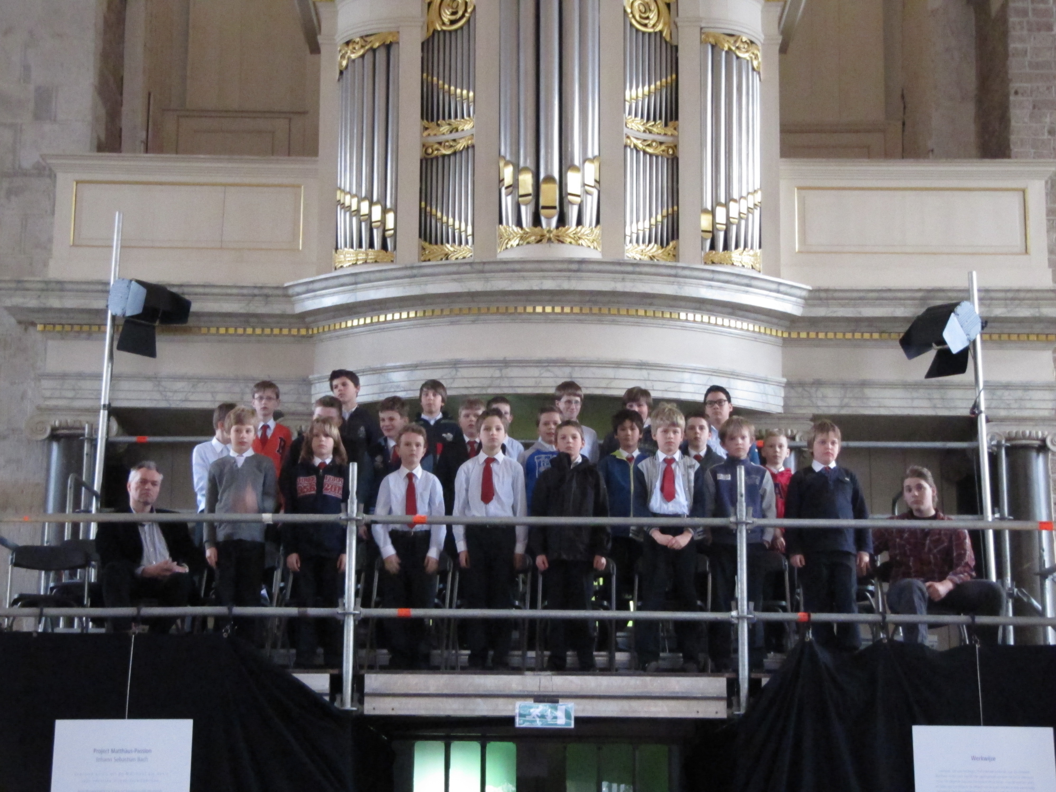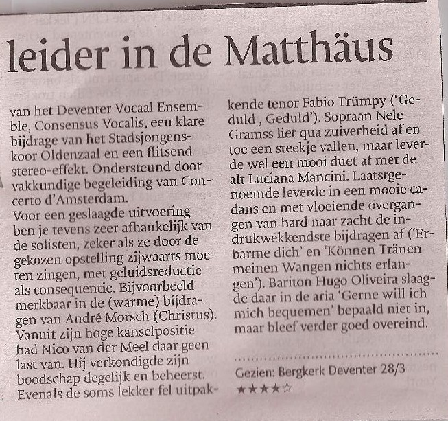 Afgelopen woensdag 20 maart gingen 16 jongens van het Stadsjongenskoor Oldenzaal ‘vreemd’, want ze zongen mee in de Matthäus Passion van J.S. Bach in de Willibrorduskerk Heeswijk Dinther met het Vocaal Ensemble Oss.l.v. van Mario Veldpape. Dit koor had een paar weken geleden een aanvraag gekregen voor een extra concert had op korte termijn een jongenskoor nodig. Een uitdaging! En een nieuwe en bijzonder leuke ervaring voor onze jongens. Zonder generale repetitie, in een kleine bezetting, in vreemde omgeving, in een totaal andere opstelling dan ze gewend zijn, optimaal presteren. Dat deden ze erg goed. Ik ben erg trots op mijn jongens!