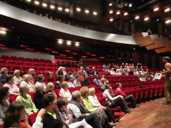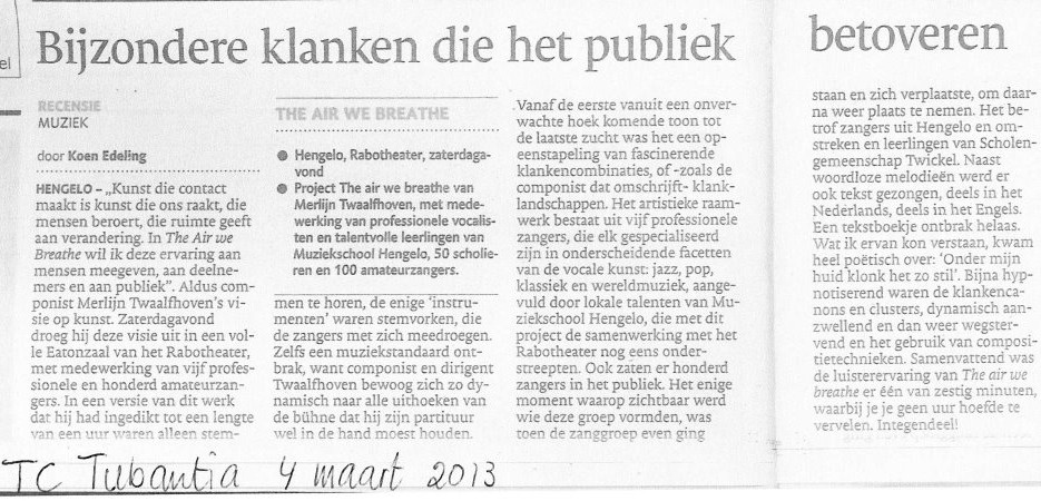 Vorige week zaterdag was de afsluiting van het project The air we breathe van Merlijn Twaalfhoven. In vier workshops had ik samen met Merlijn een koor klaargestoomd om het publiek uiteindelijk op het ‘verkeerde been’ te zetten. Er werden echte nootjes ingestudeerd maar de koorleden moesten ook leren improviseren. Maar niet zomaar improviseren. De zangers moesten tonen en ritmes overnemen waardoor niet alledaagse samenklanken ontstonden. Vijf solisten en een groep scholieren maakten het stuk uiteindelijk compleet en lieten samen met het koor het publiek na het concert in verbazing achter. Wat was er nu wel ingestudeerd en wat niet. Wie deed en nu wel mee en wie niet?