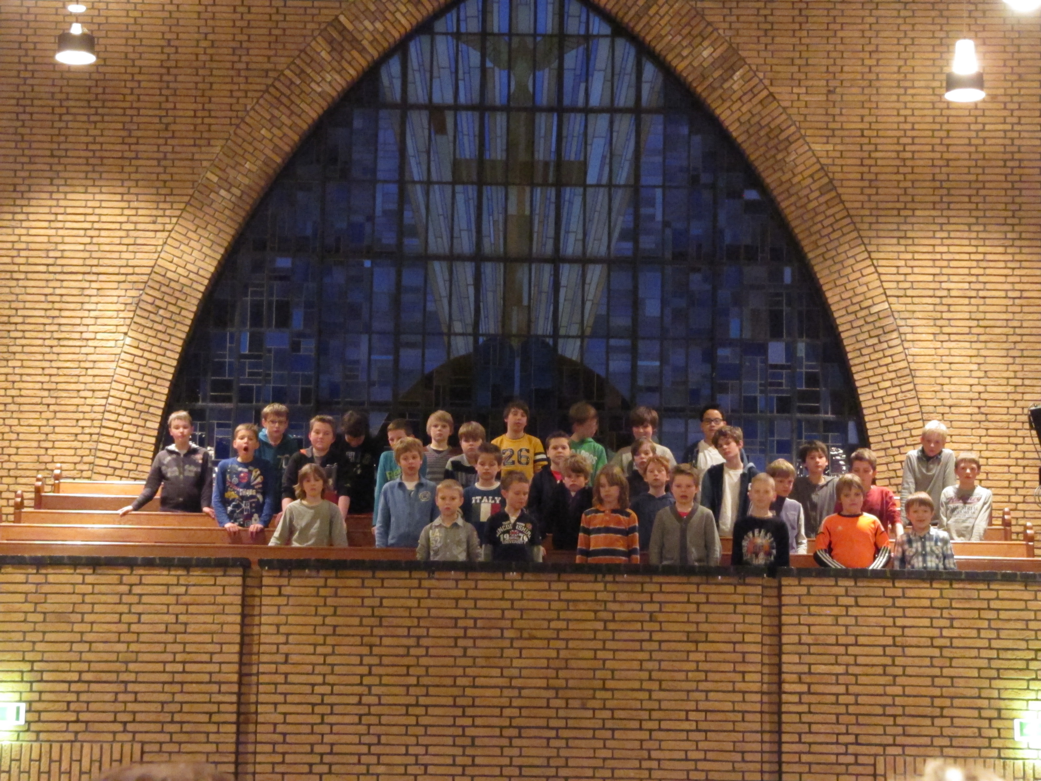 Het Stadsjongenskoor, dat onder leiding van Mariette Effing staat, zingt vanaf de koorzolder achter in de Basiliek, wat een zeer bijzonder effect heeft op het geheel.