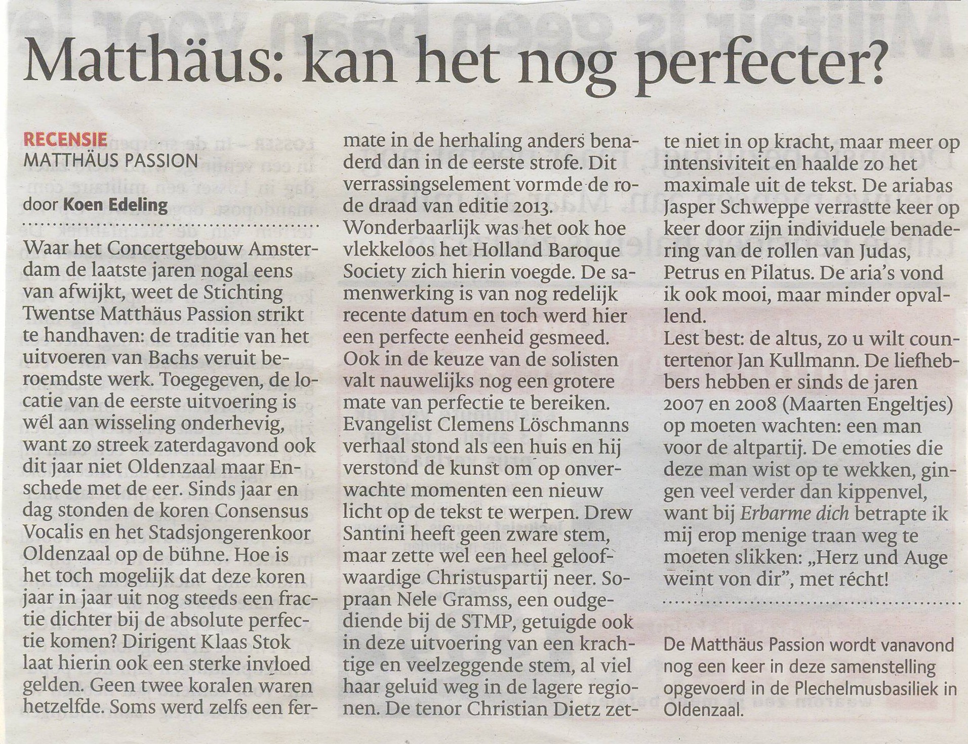 OLDENZAAL – De jaarlijkse uitvoering van de Matthäus Passion van Johann Sebastian Bach zal op maandag 25 maart 2013 in de Plechelmus Basiliek in Oldenzaal worden uitgevoerd.