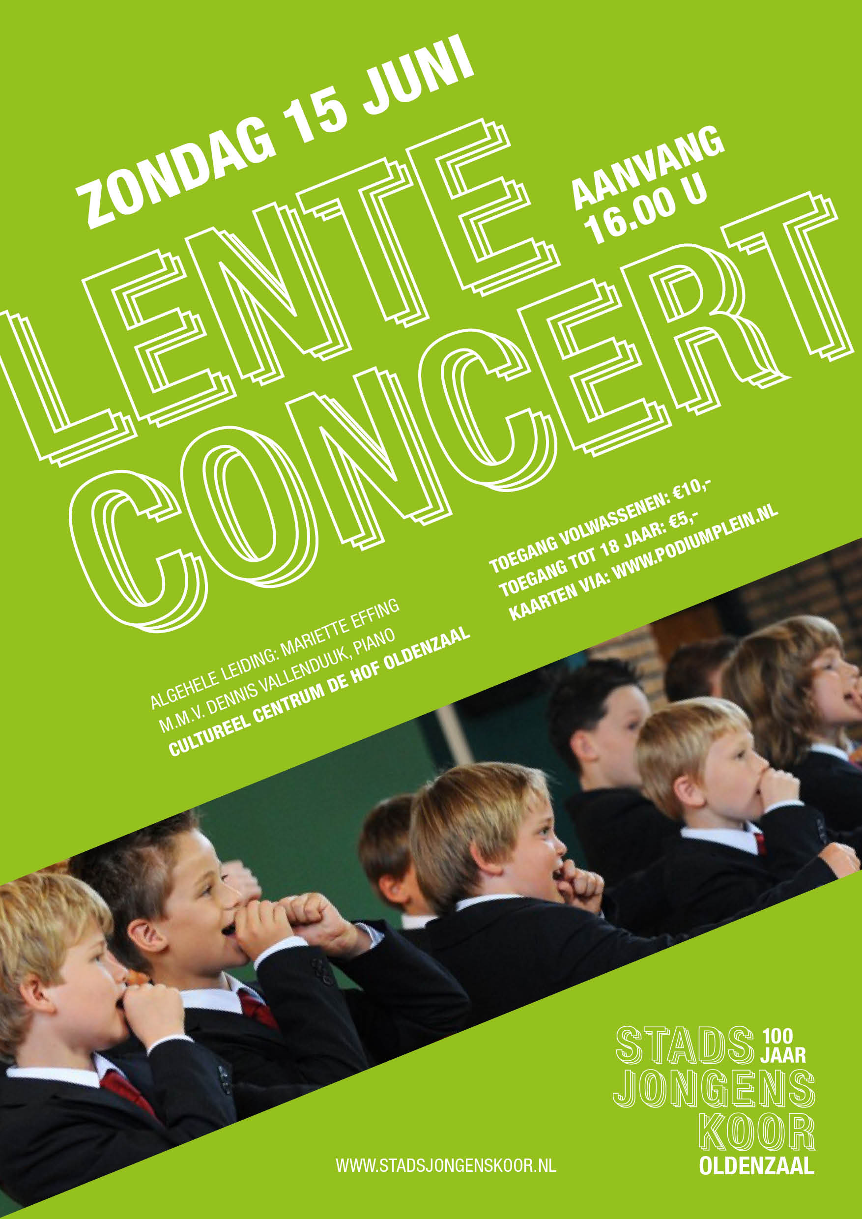 Zo begint het Stadsjongenskoor op zondag 15 juni het jaarlijkse lenteconcert. Tijdens dit concert zullen alle koren van het Stadsjongenskoor afzonderlijk optreden maar ook samen. Het wordt één grote beestenboel. Het Opleidingskoor zingt over ratten en muizen, het Middenkoor over muggen en een gestorven garnaal, het Concertkoor over een te dikke kat en het Jongemannenkoor over een zeehond. Ook zal het kersverse nieuwe mannenensemble Vocal Fellas van zich laten horen. Dit nog kleine ensemble is speciaal opgericht voor jongemannen van het Stadsjongenskoor vanaf 25 jaar die graag met elkaar willen blijven zingen. Het Stadsjongenskoor staat onder leiding van Mariette Effing. Dennis Vallenduuk begeleidt het koor op de piano en is tevens muzikaal leider van de Vocal Fellas.