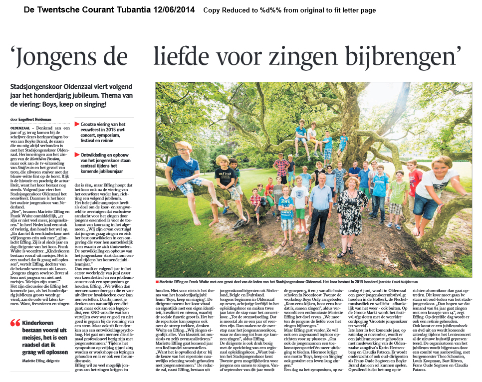We zijn er al geruime tijd mee bezig maar vandaag stond het toch maar in de krant. Boys, keep on singing, het project in het kader van het 100 jarig bestaan van het Stadsjongenskoor Oldenzaal. Ik heb er enorm veel zin in en de jongens ook!