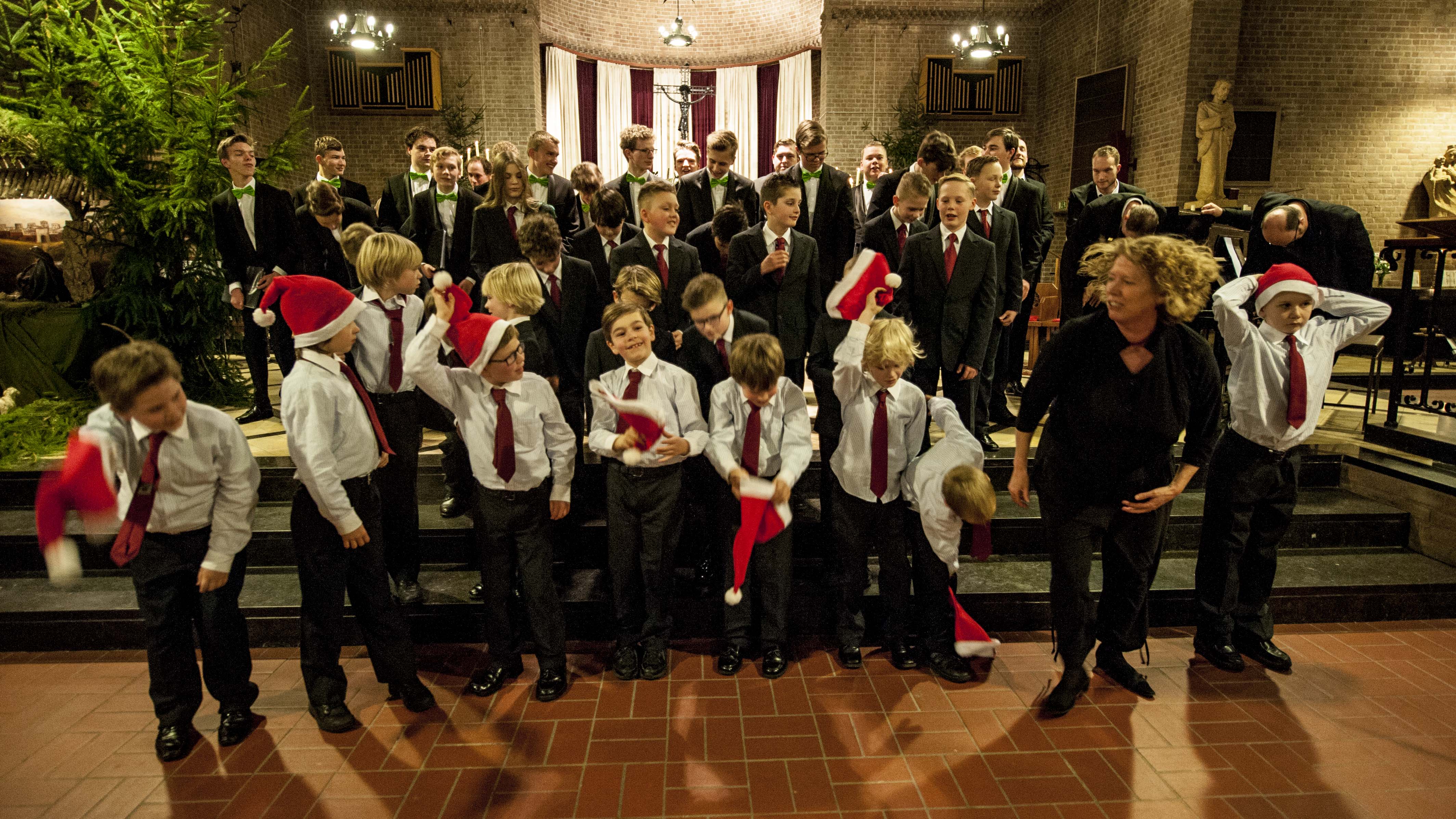 De koren sluiten het concert gezamenlijk af met bekende liederen als Joy to the world en We wish you a merry Christmas. Maar niet voordat dirigent Mariette Effing de jongens en jongemannen tot grote hoogte laat stijgen met het lied Child of Bethlehem: He’s the King of Kings!