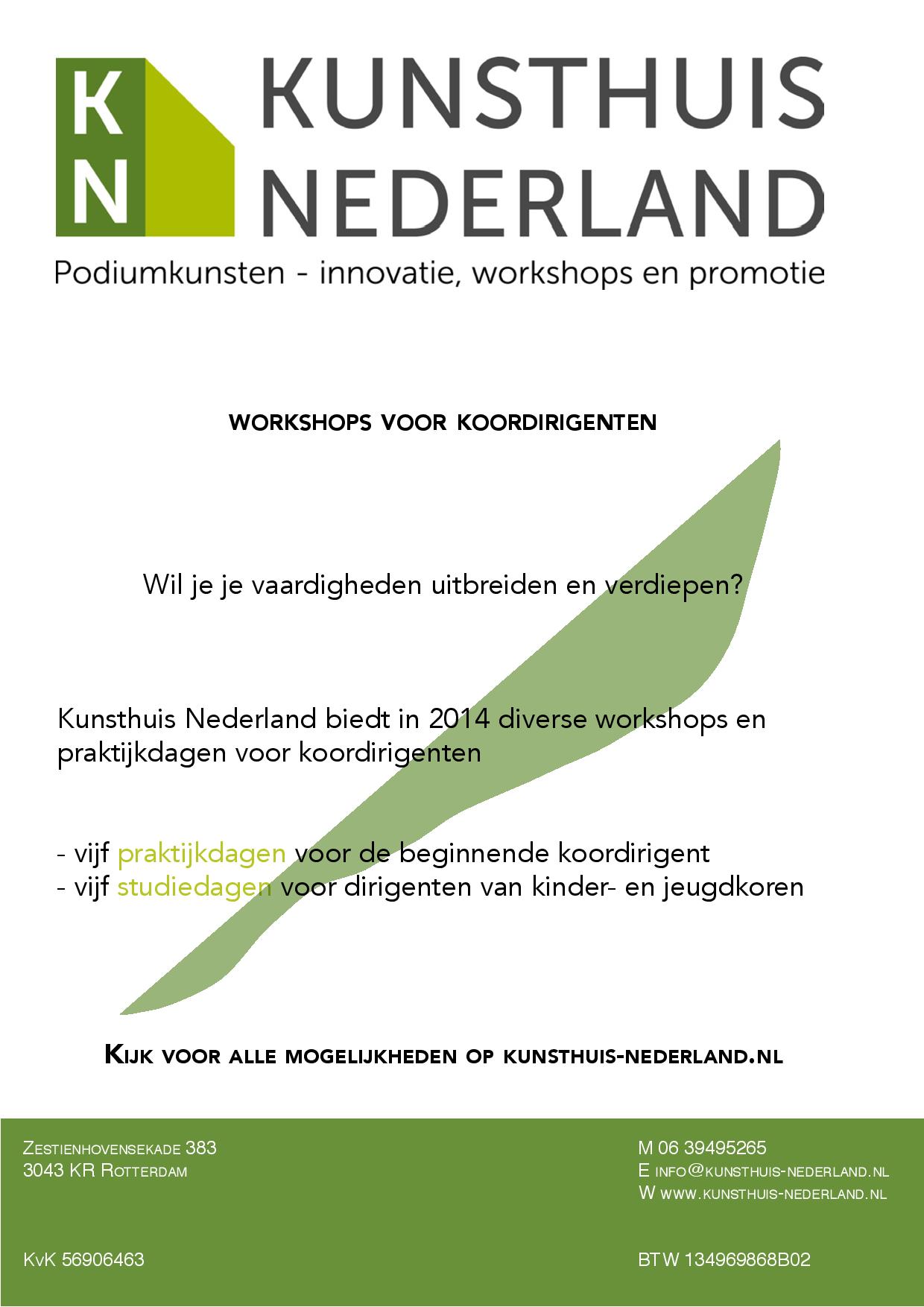 Kunsthuis-nederland.nl organiseert workshops en masterclasses voor dirigenten, theatermakers en regisseurs en choreografen. Ze werkt daarin samen met inspirerende docenten die hun sporen in hun vakgebied verdiend hebben. De masterclasses en workshops kunnen door het hele land plaatsvinden en daarom werkt Kunsthuis.nl samen met lokale partners.